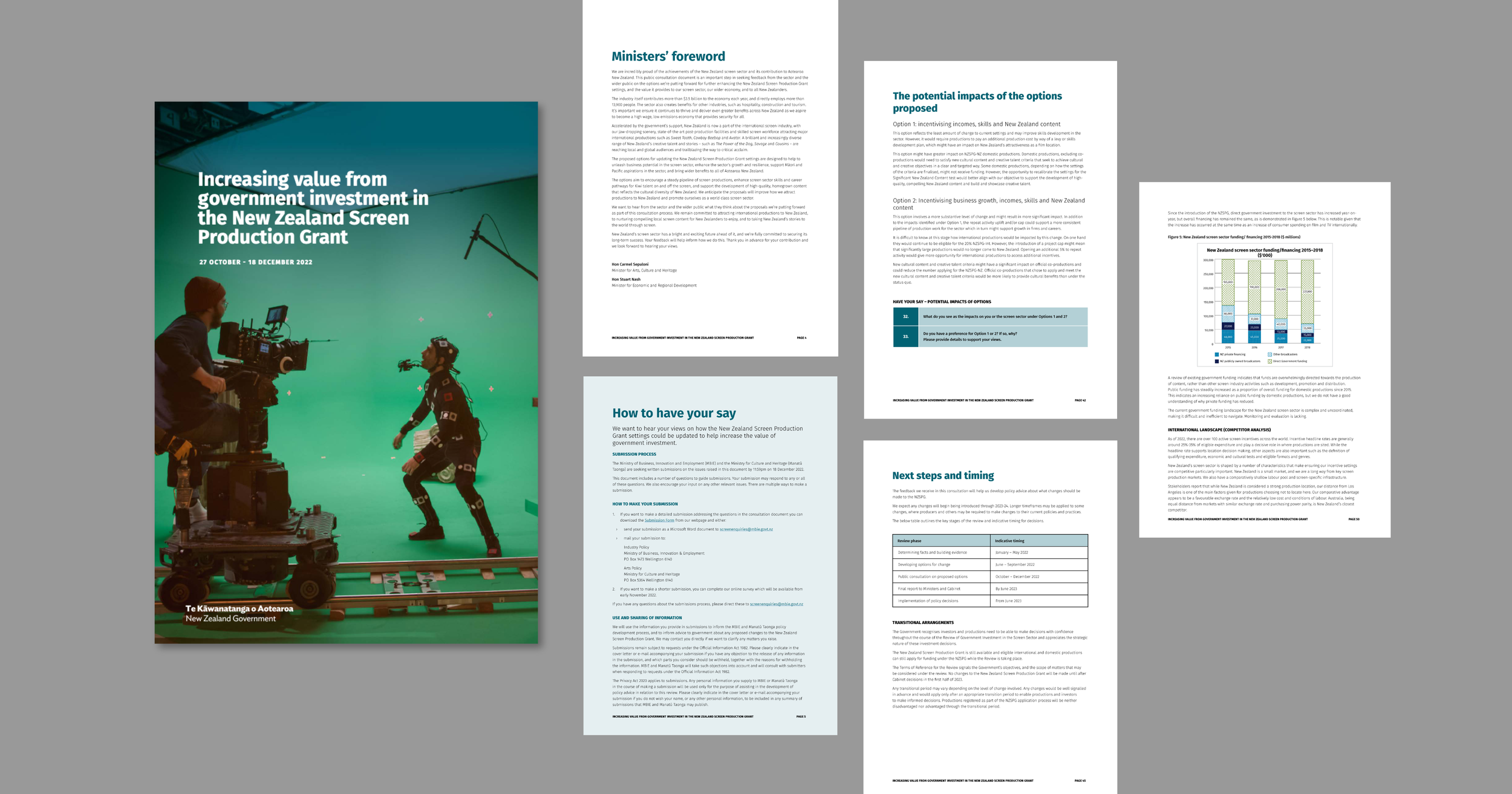 The report outlines the joint MBIE–MCH Screen Sector Review, an evidence-based assessment of how government investment supports the performance, sustainability, and future direction of Aotearoa’s screen industry. Developed in partnership between the Ministry of Business, Innovation and Employment and Manatū Taonga Ministry for Culture and Heritage, the review brings together economic analysis, cultural outcomes, and sector insights to inform a coherent, long-term approach to screen production. The collaboration reflects the complementary roles of both agencies—MBIE’s focus on economic development and industry growth, and MCH’s leadership in cultural, creative, and national identity outcomes.